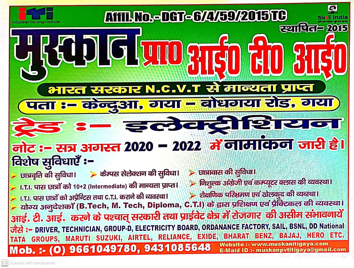 Muskan Private Industrial Training Institute, Gaya (Bihar) is as a Industrial Training Center (ITC) under private Management (AFFILIATED BY NCVT. GOVT. OF INDIA)